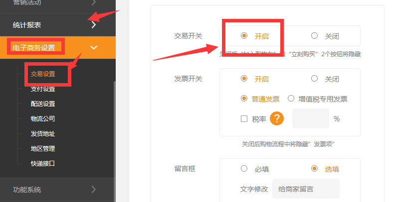 1.在后台 电子商务设置-》交易设置中 将交易开关 设置为开启。