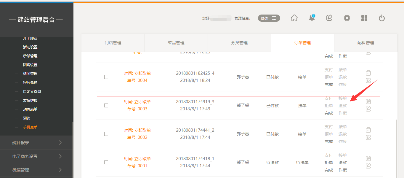 6.在后台“订单管理”中,当商家已经接单后,前台用户则不能申请“退款”,如果商家没有接单,则用户可以进行“申请退款操作”,如图所示: