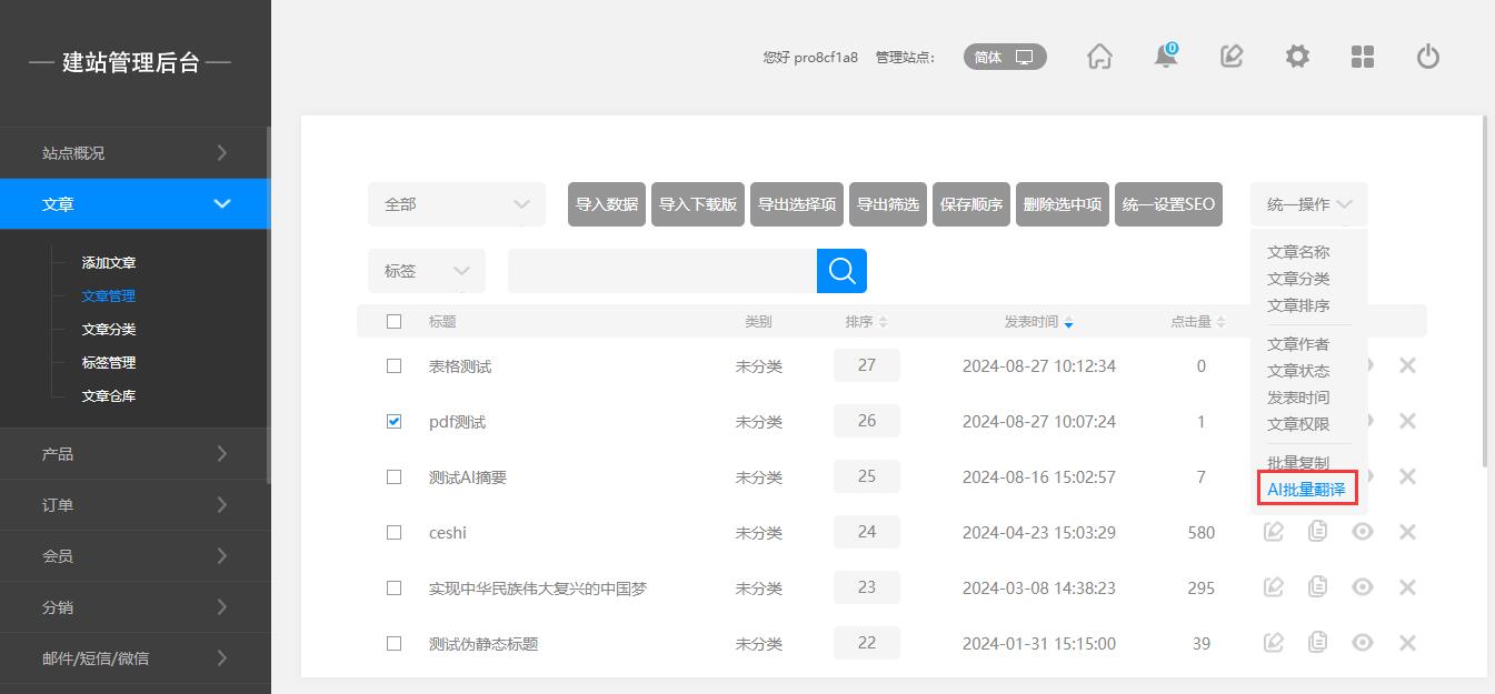 后台:文章管理—勾选文章—AI批量翻译